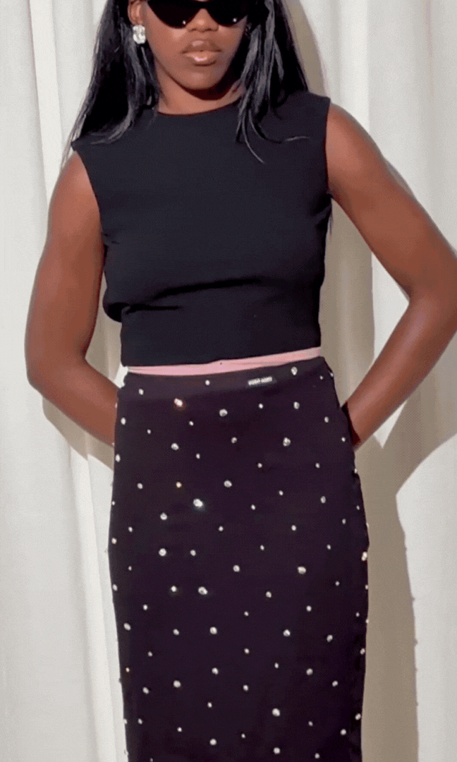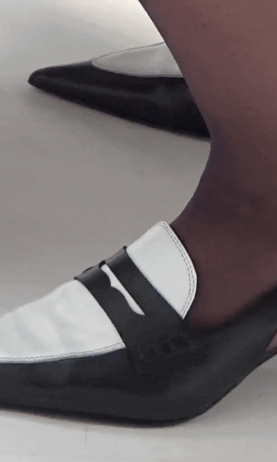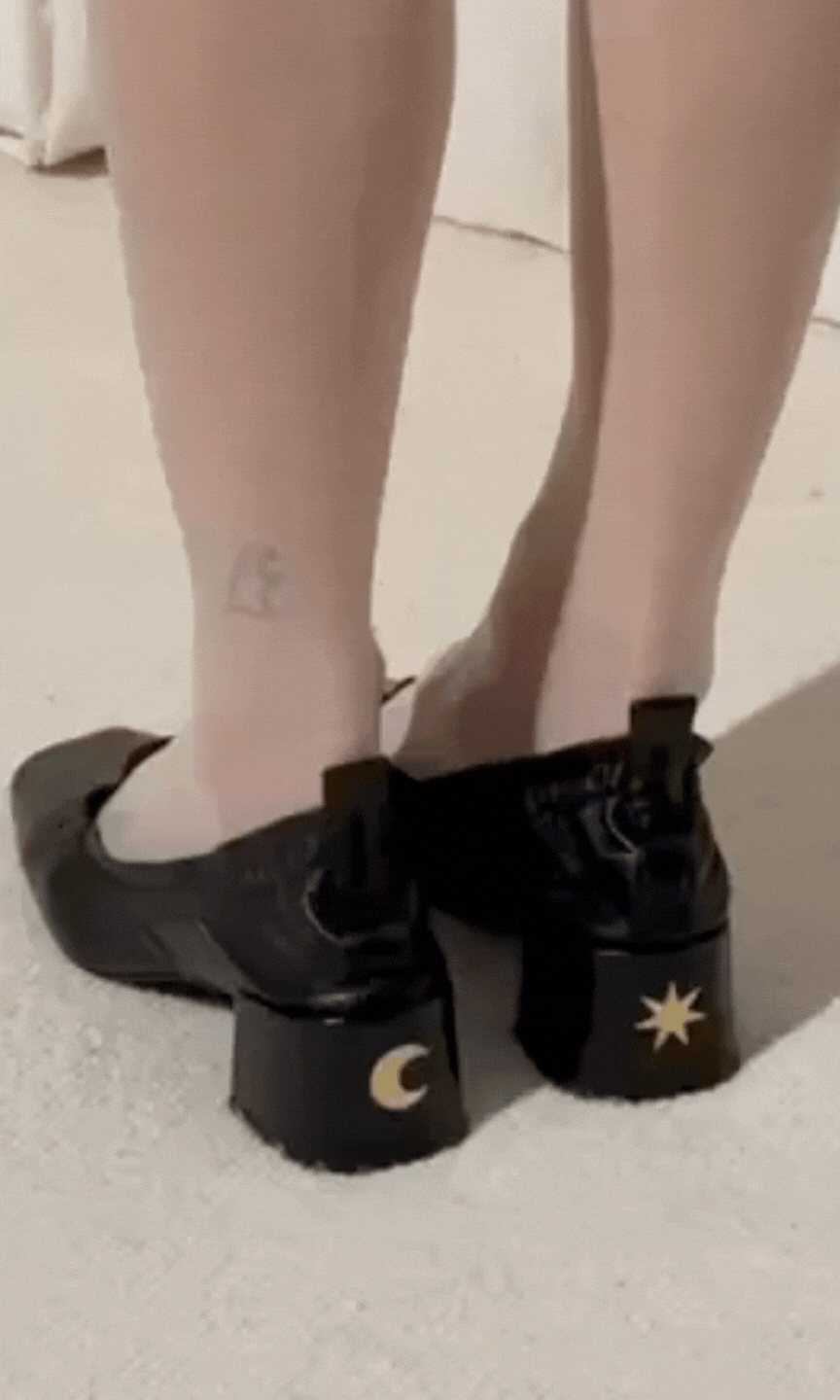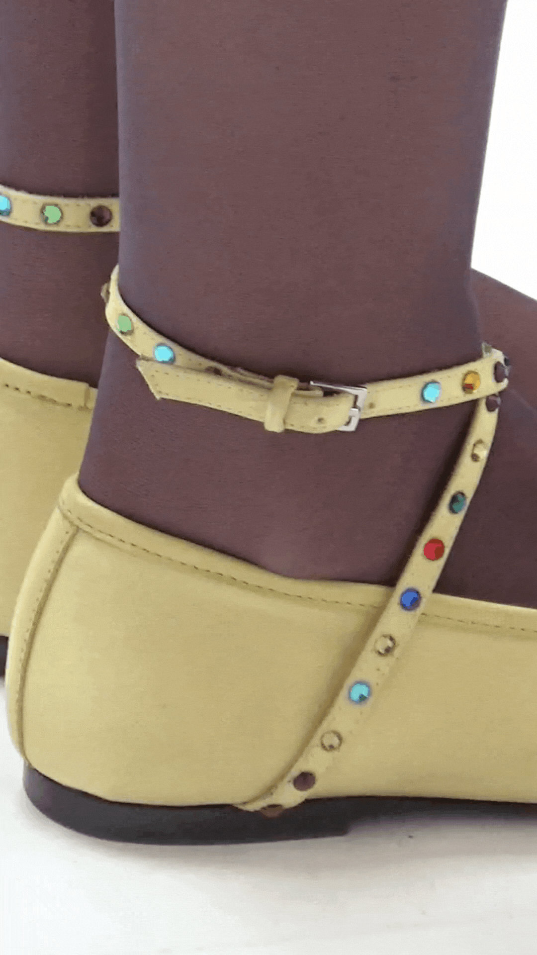 Model wearing blue jeans with EDLA Saturn black ballet flats with ankle straps embellished with crystals.