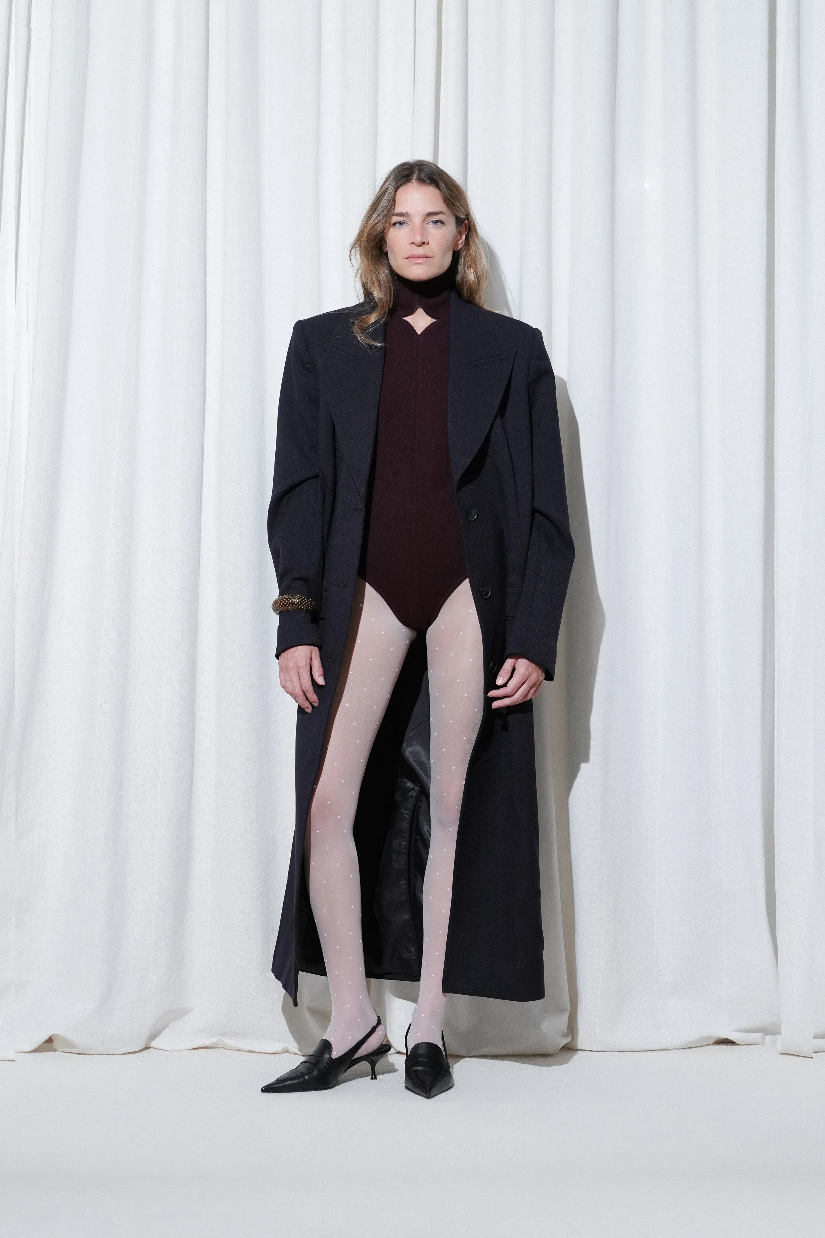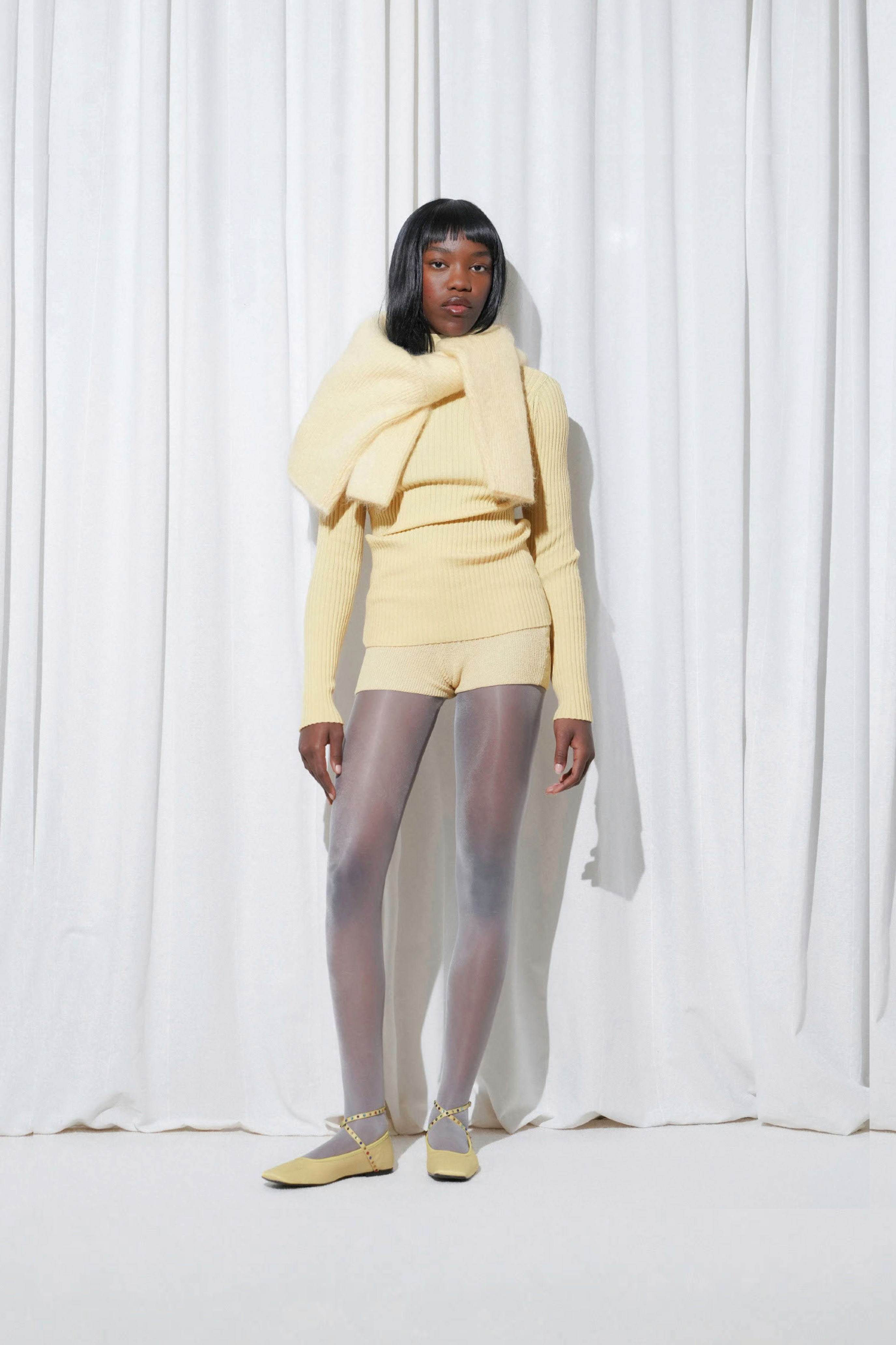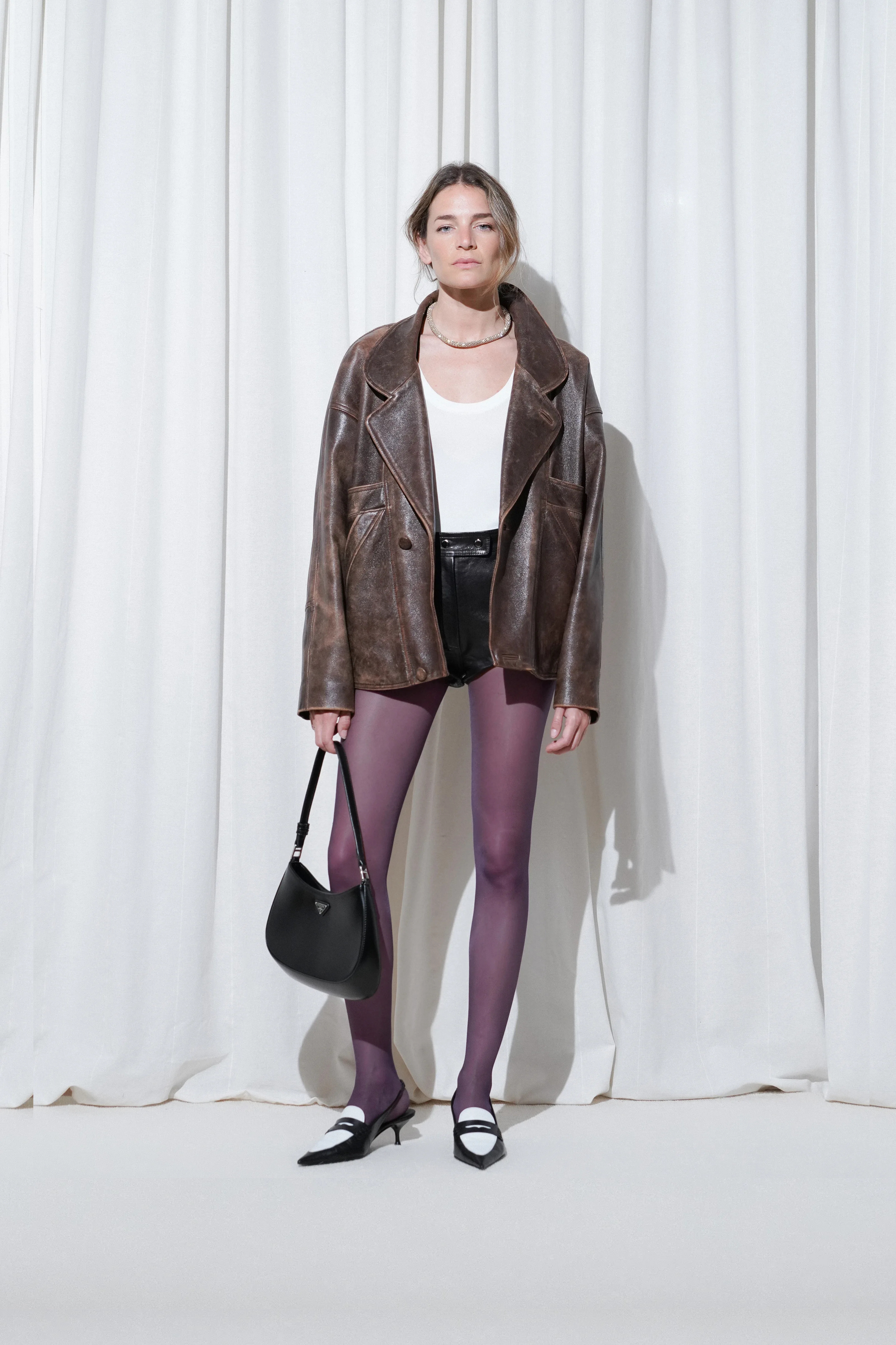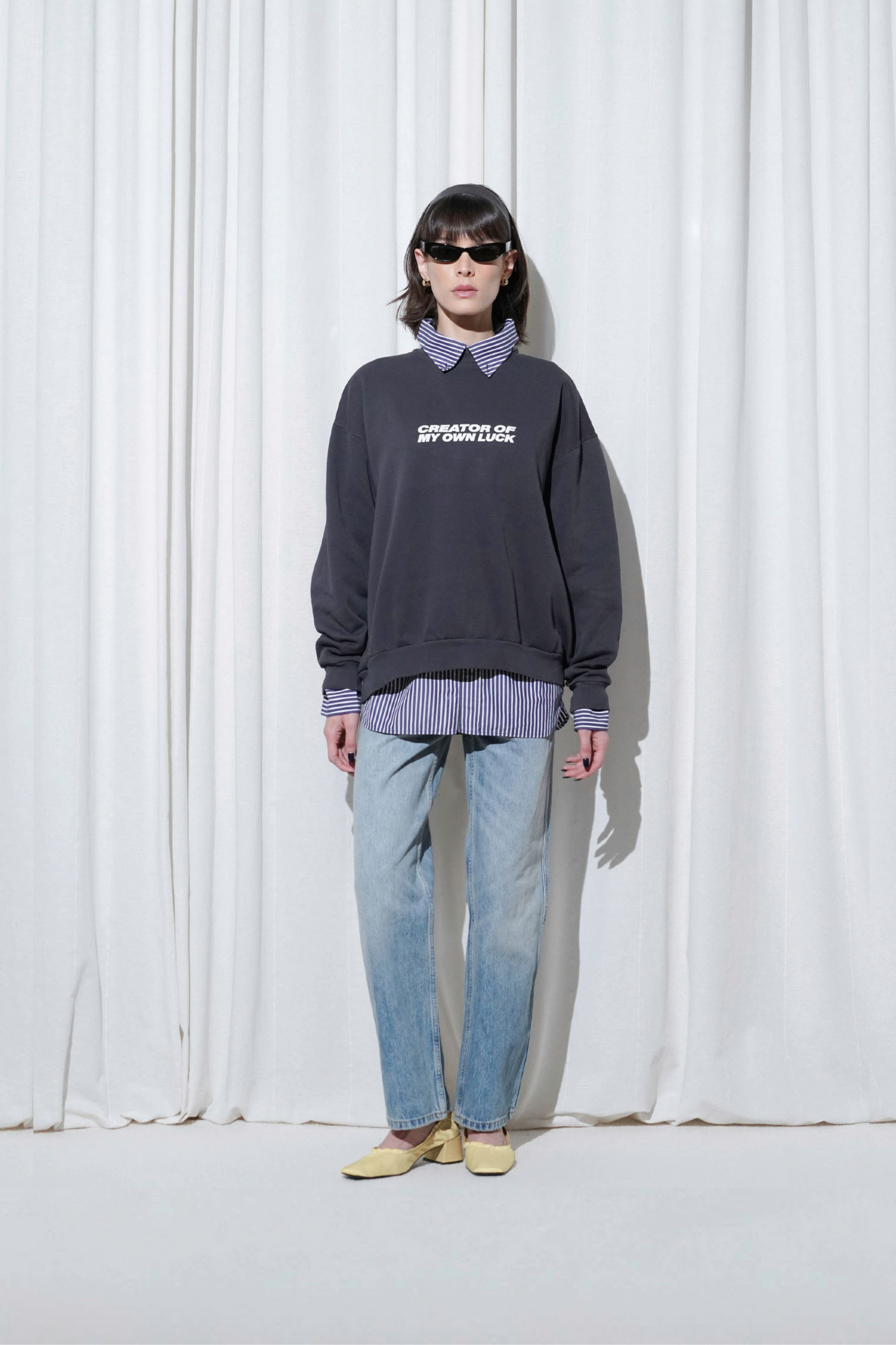 Model wearing blue jeans with EDLA Saturn black ballet flats with ankle straps embellished with crystals.