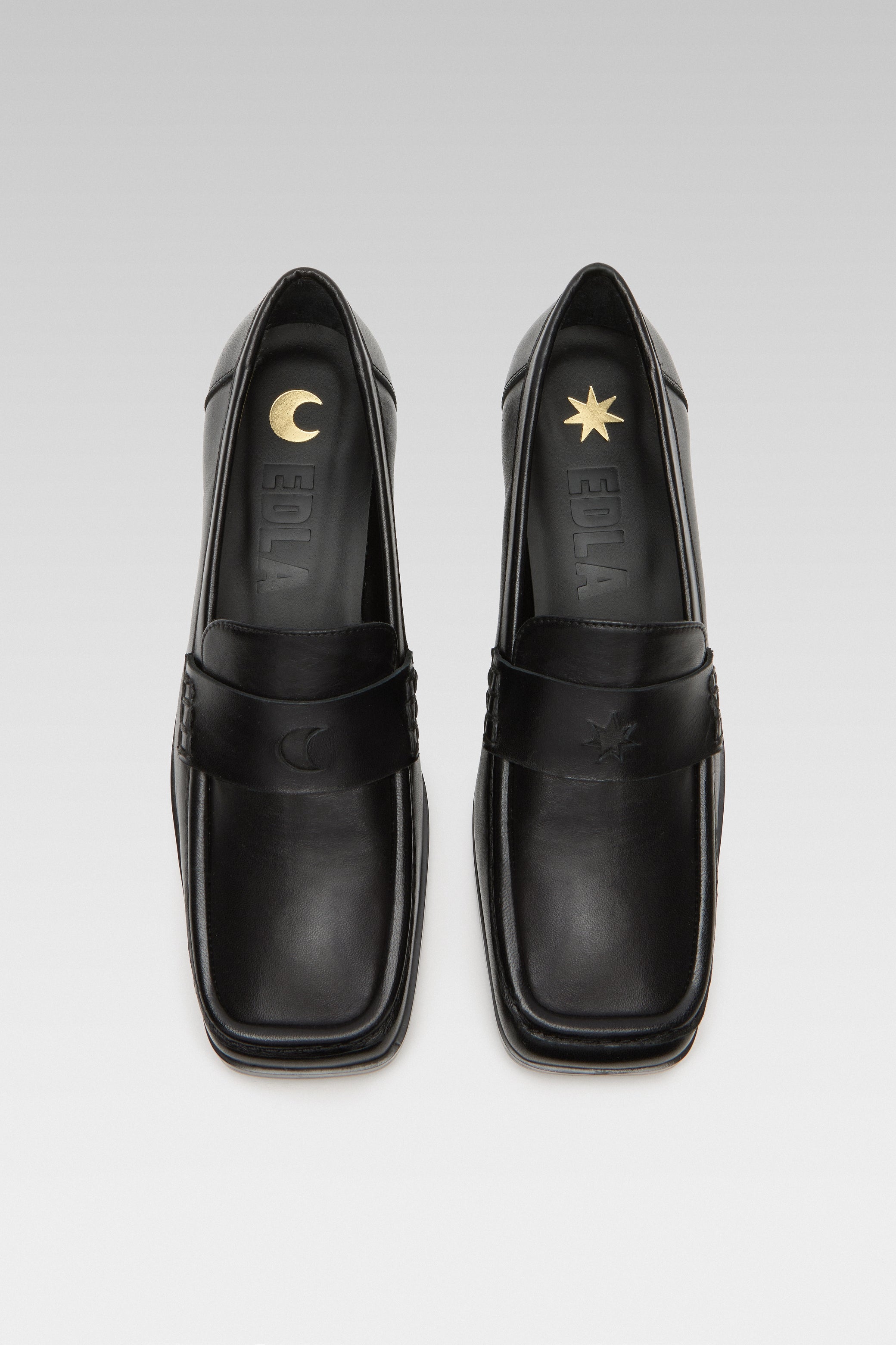 Crafted from soft nappa lambskin, the Earth Black Loafer features a squared toe and a contrast cut-out band with moon and star details. Finished with EDLA's signature cosmic insoles.