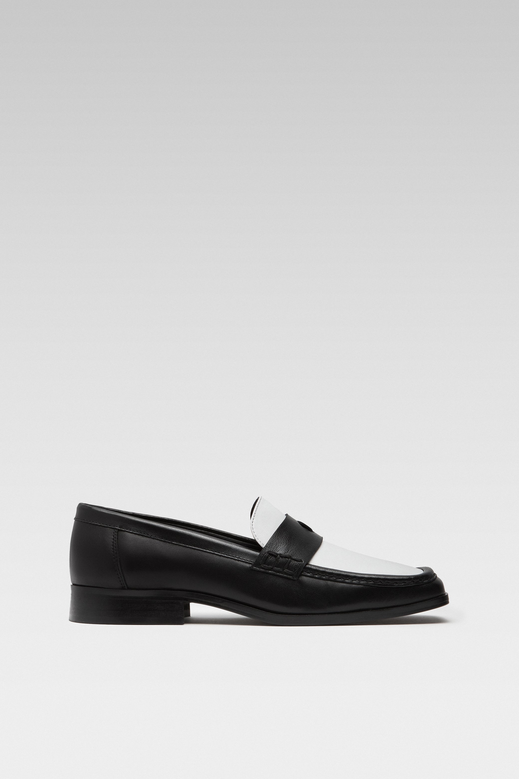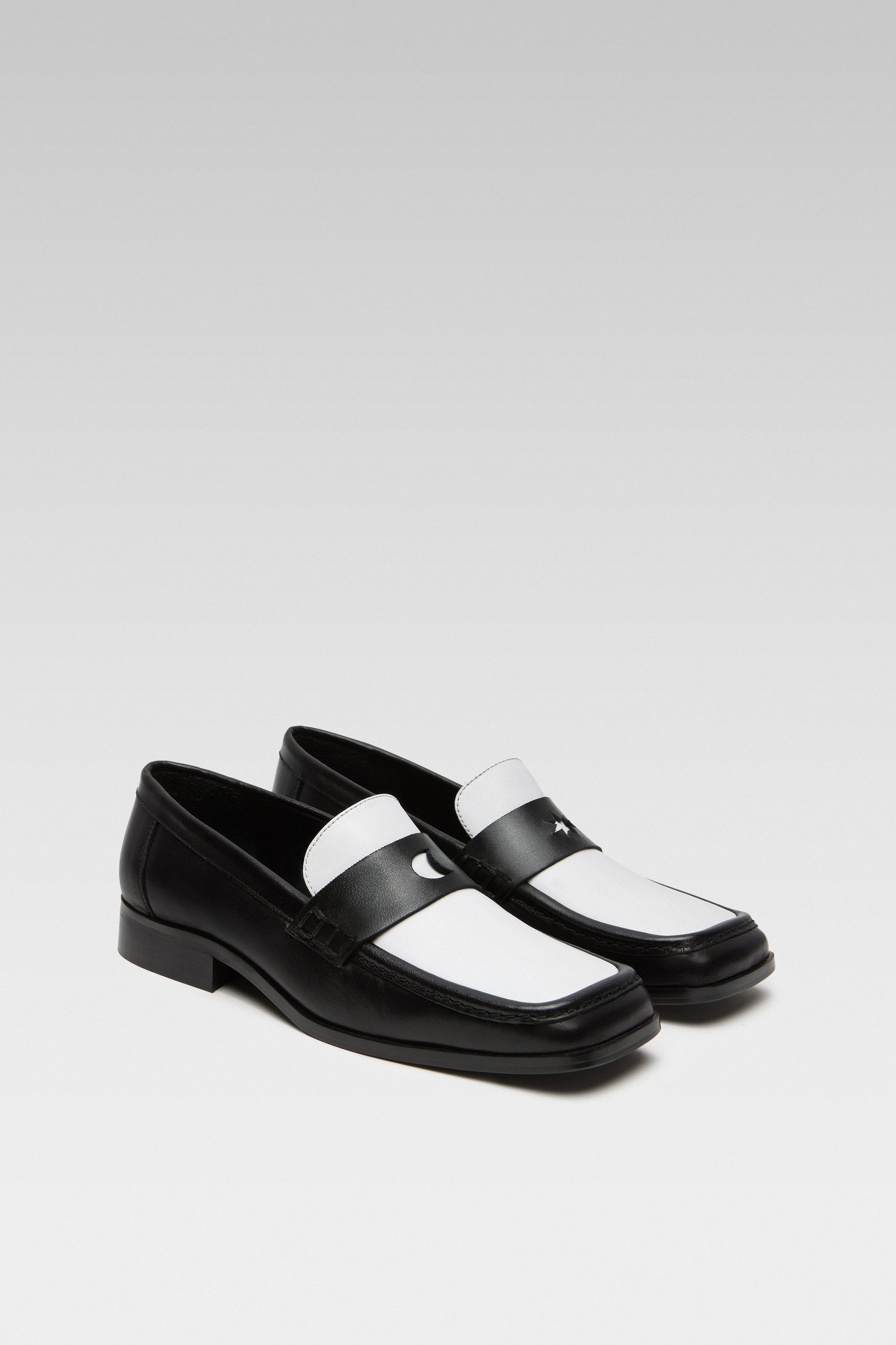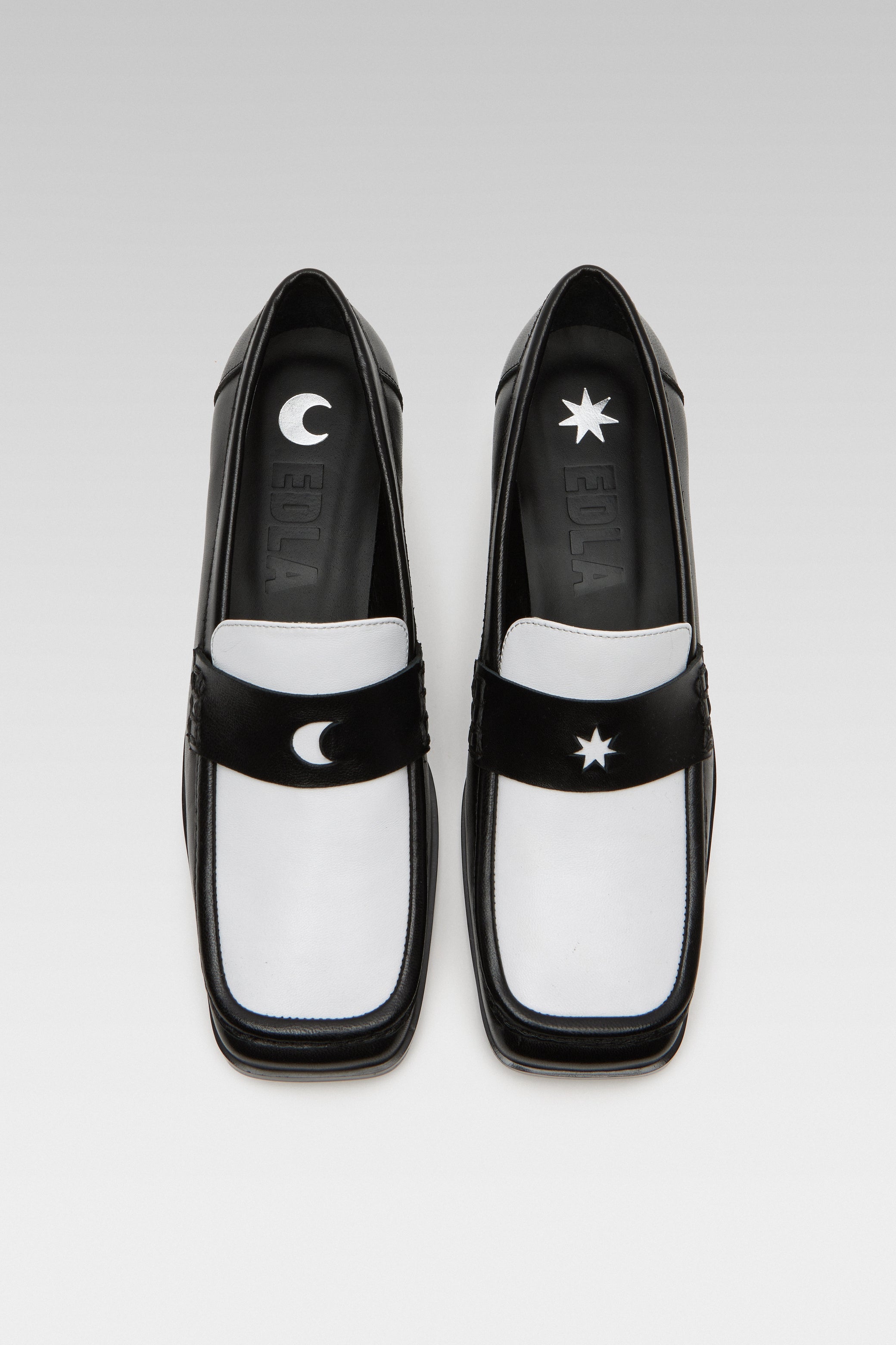 Crafted from soft nappa lambskin, the Earth Black and White Loafer features a squared toe and a contrast cut-out band with moon and star details. Finished with EDLA's signature cosmic insoles.