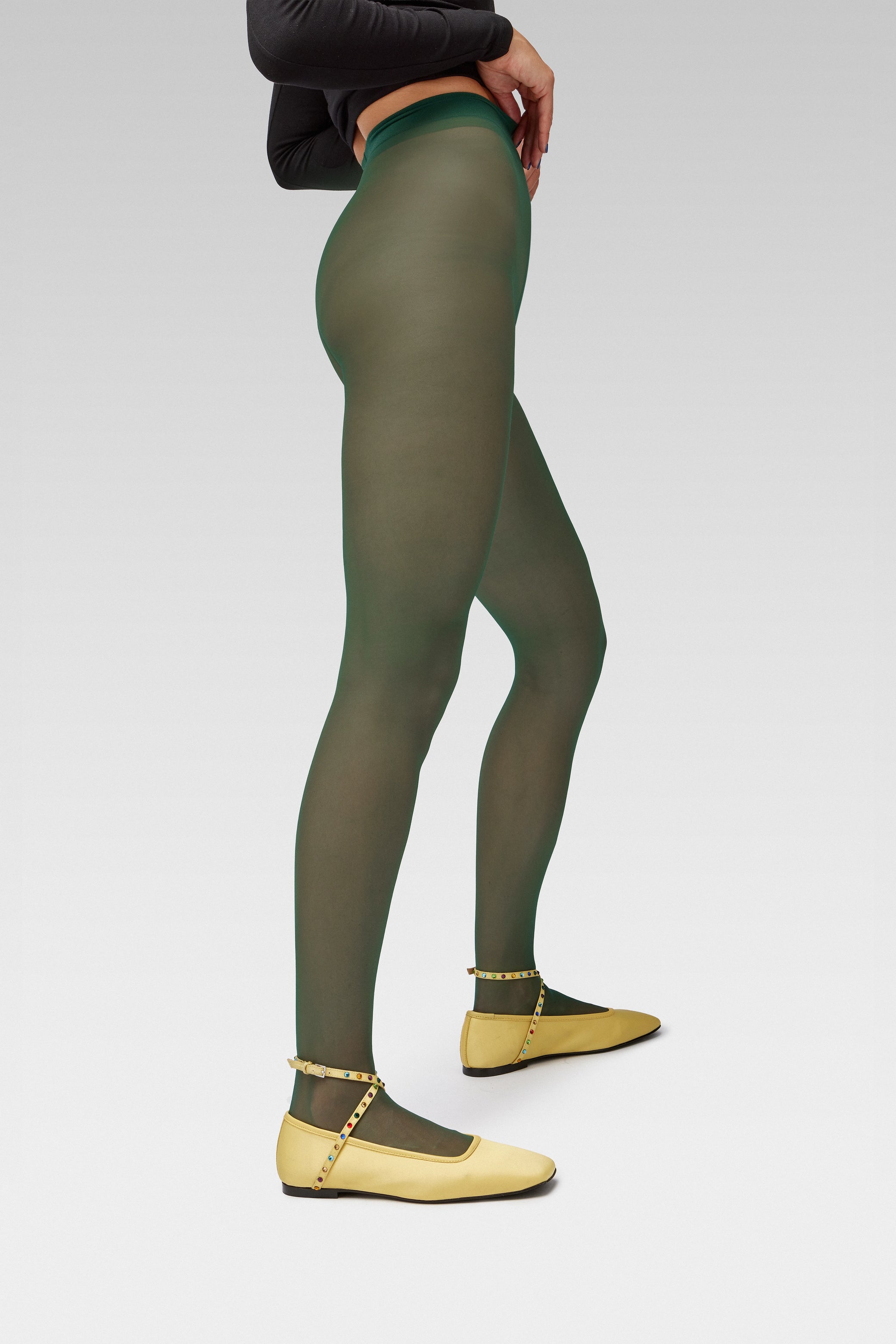 Crafted from a silky 20 denier finish, the Galaxy Tights feature a sheer body, shaped silhouette, and an invisible toe for a seamless look. These dark green tights are a statement piece for day or night.
