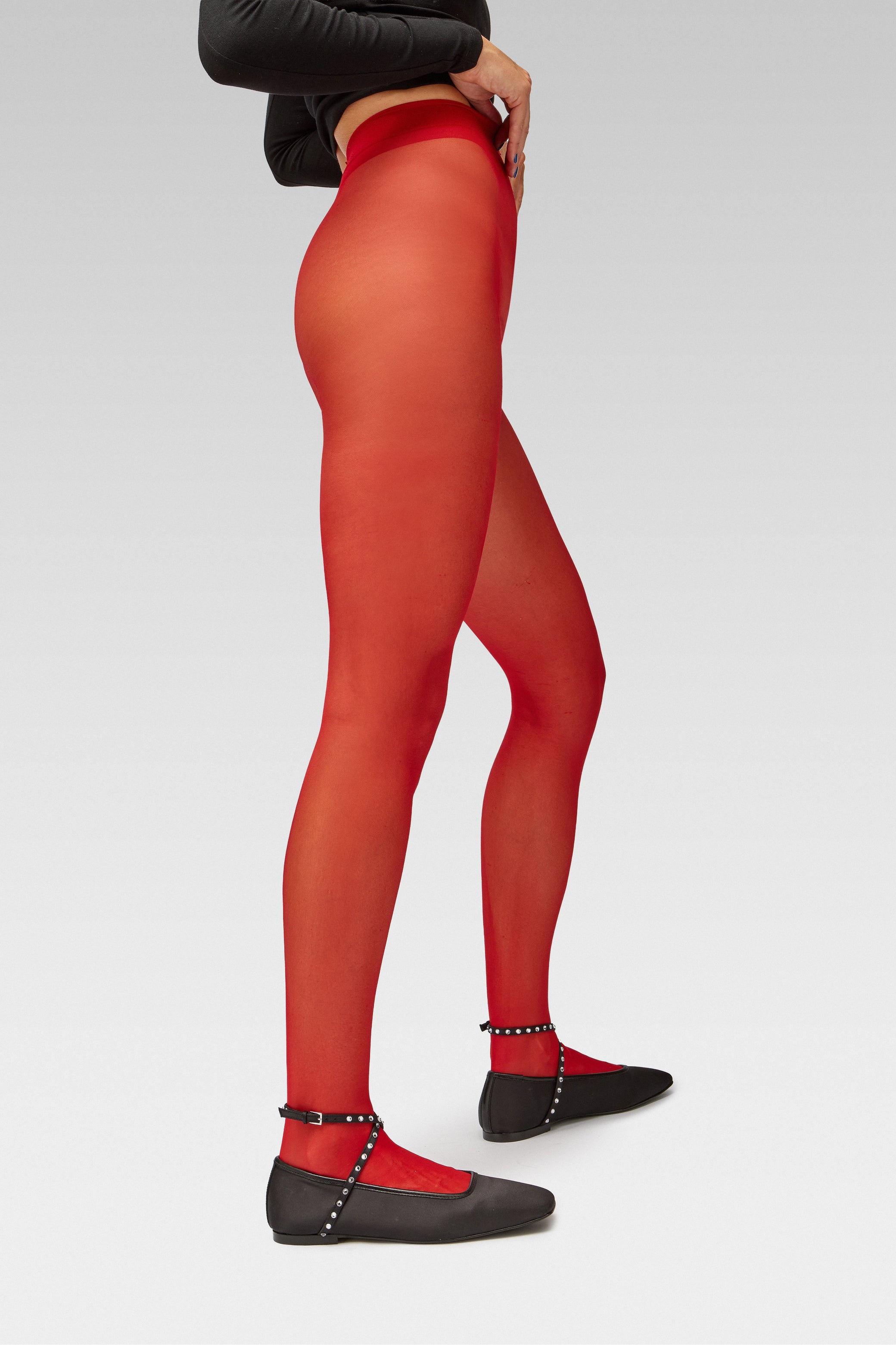Crafted from a silky 20 denier finish, the Galaxy Tights feature a sheer body, shaped silhouette, and an invisible toe for a seamless look. These red tights are a statement piece for day or night.