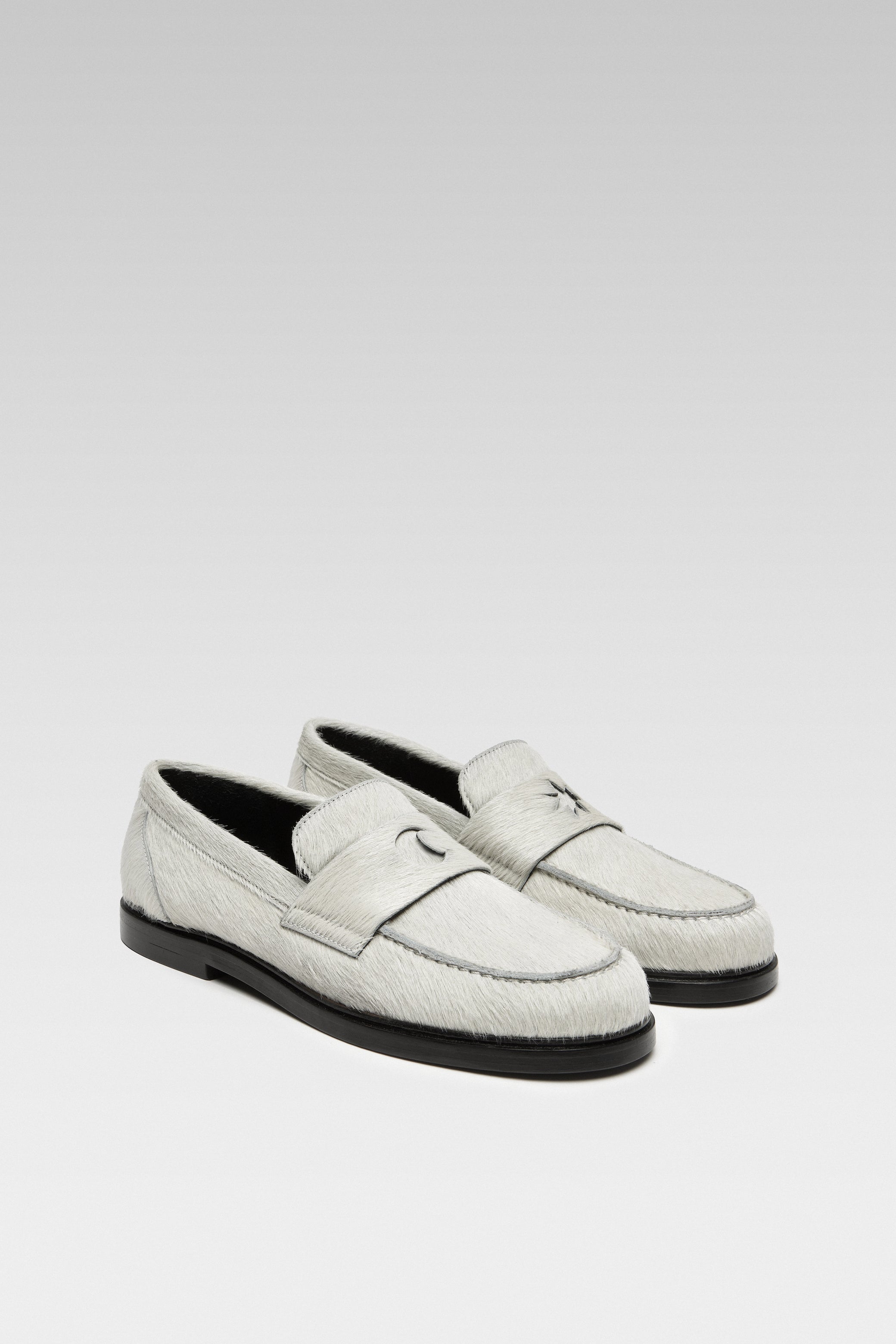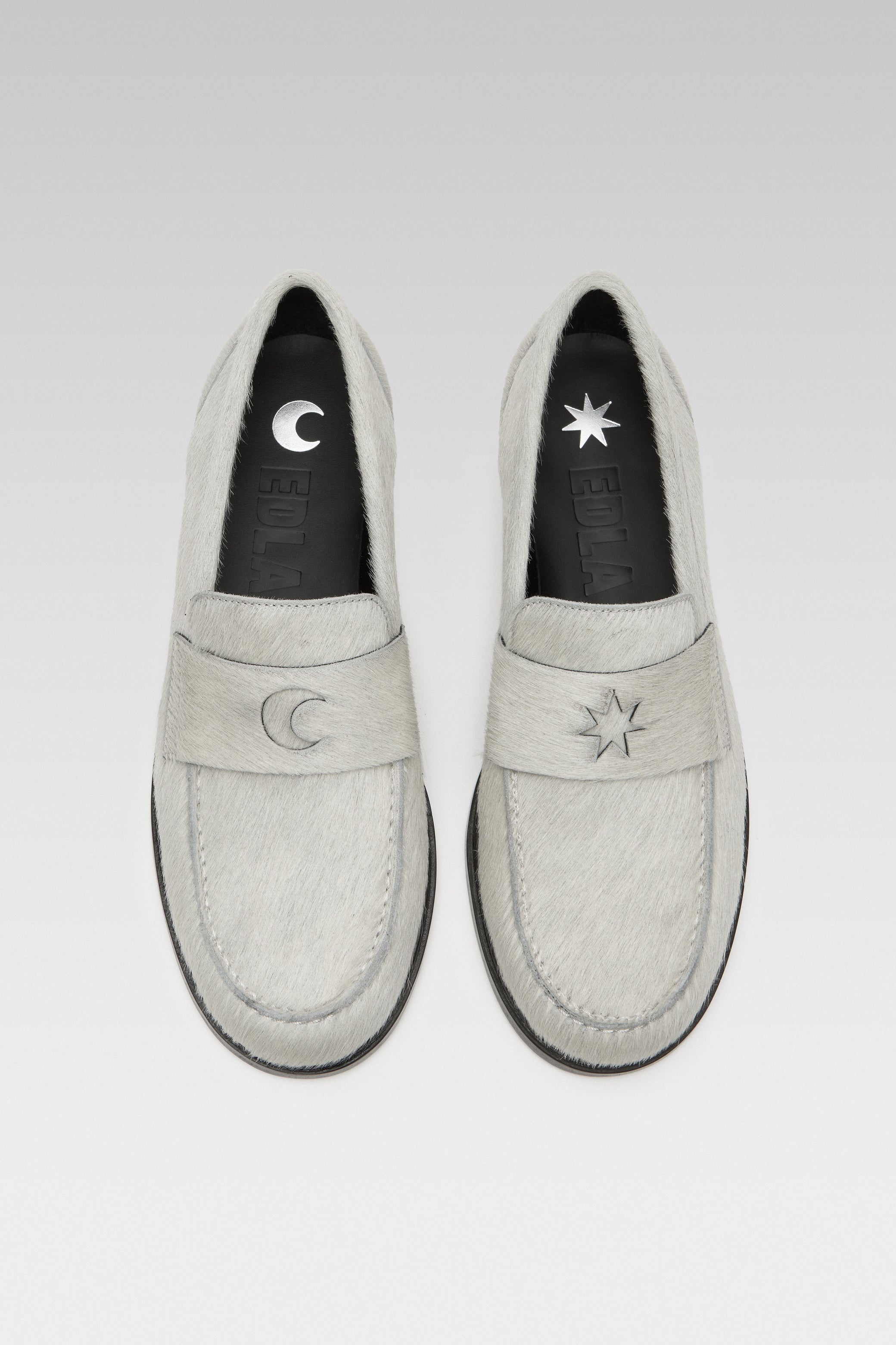 Crafted from soft calf hair, the Jupiter White Loafer features a rounded toe and a cut-out band with moon and star details. Finished with EDLA's signature cosmic insoles.