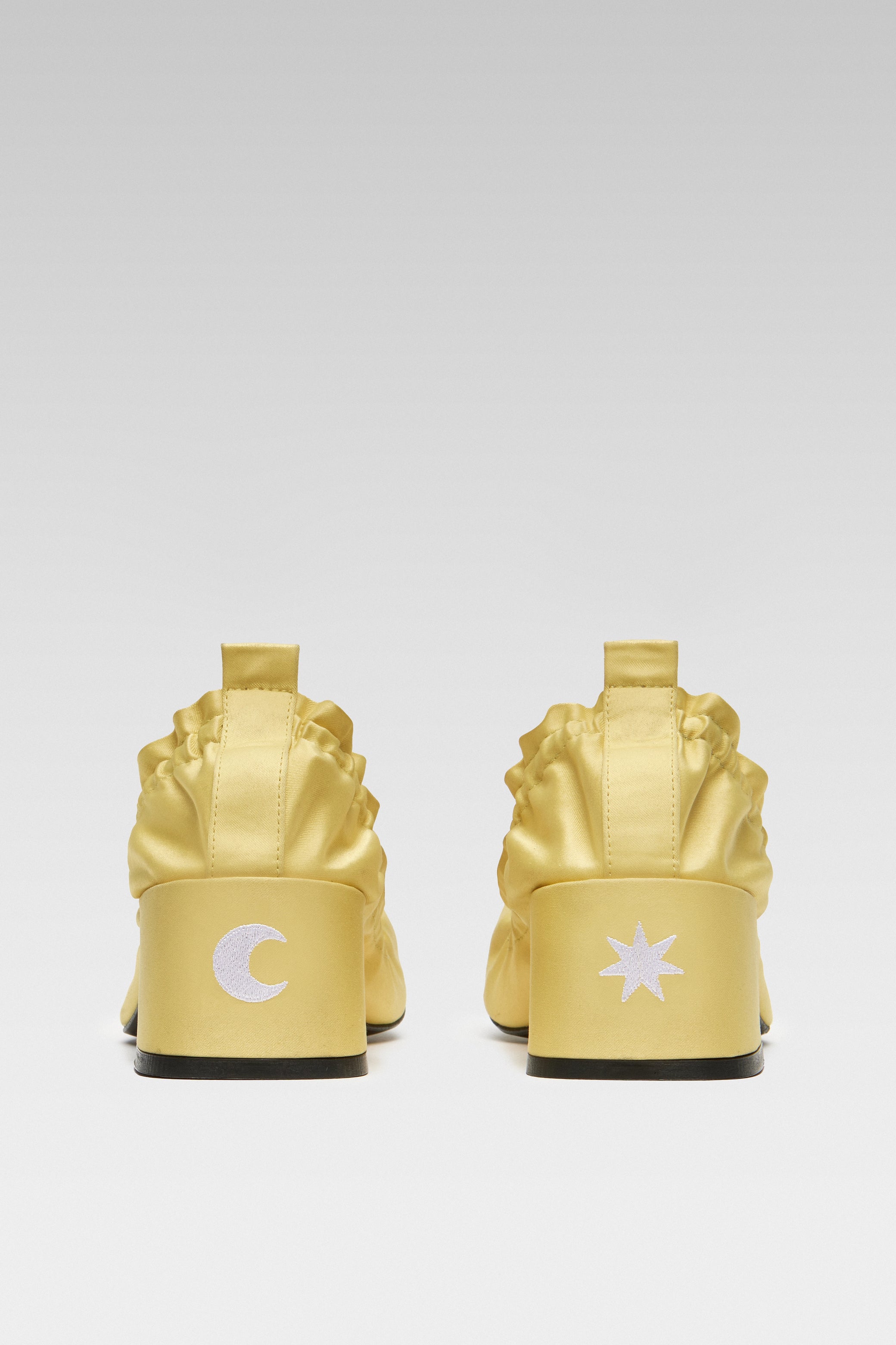 Crafted in satin, the Mercury Butter Yellow Kitten Heel features a ruched edge, squared toe, and a 5cm block heel finished with moon and star embroidered details in white.