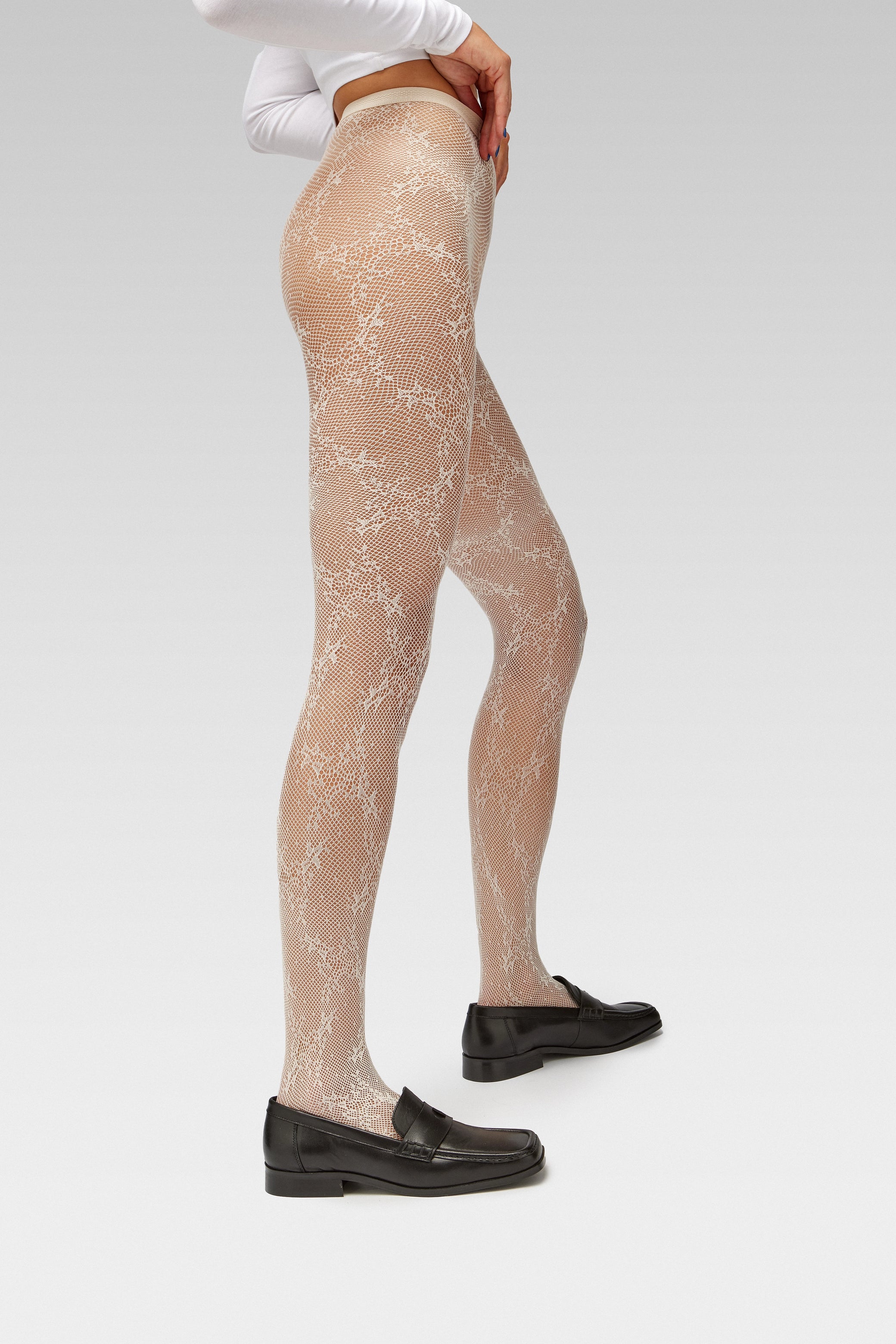 Crafted from recycled yarns, the Starlight Lace White Tights feature an all-over floral fishnet pattern inspired by Art Nouveau. A modern take on the classic fishnet.