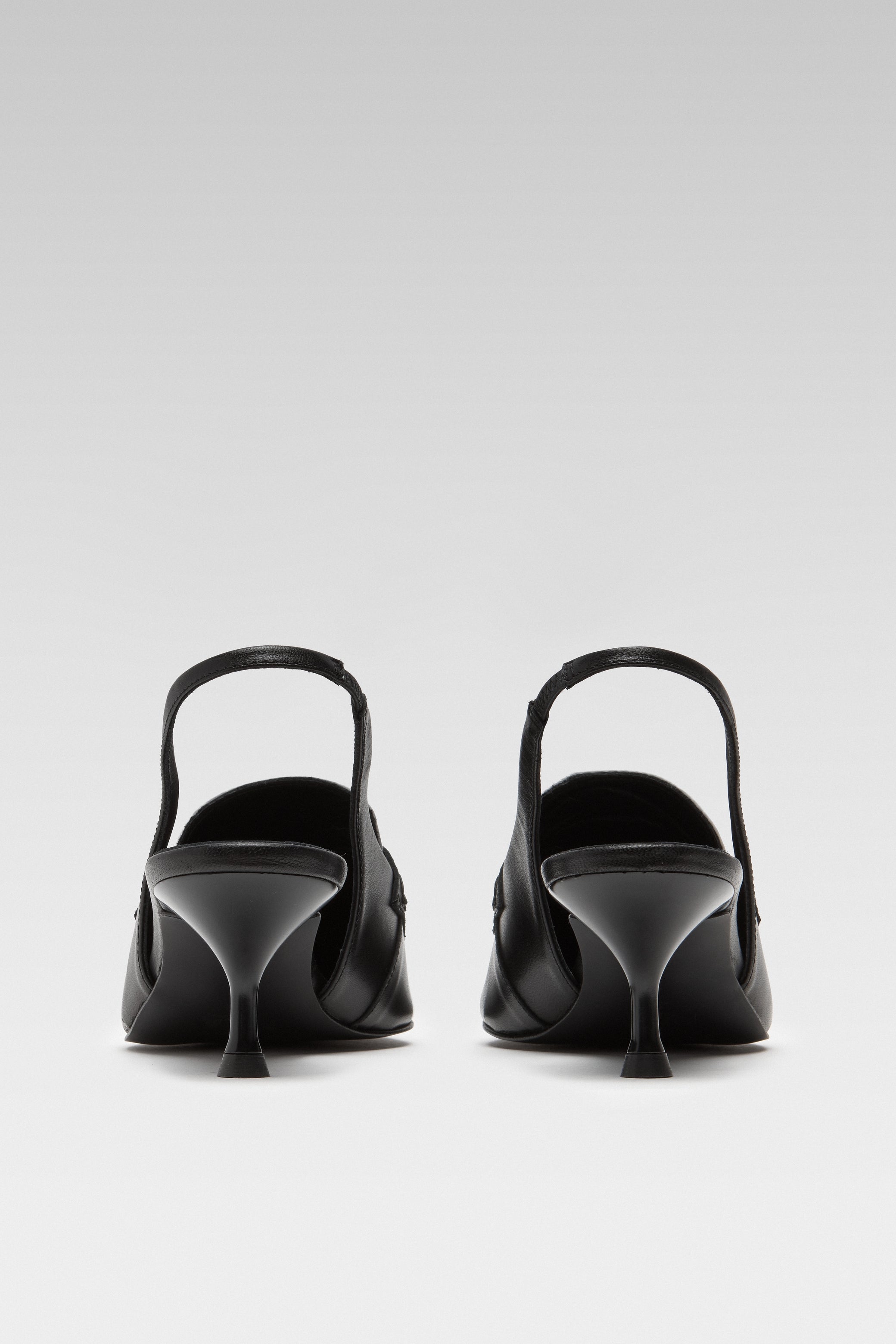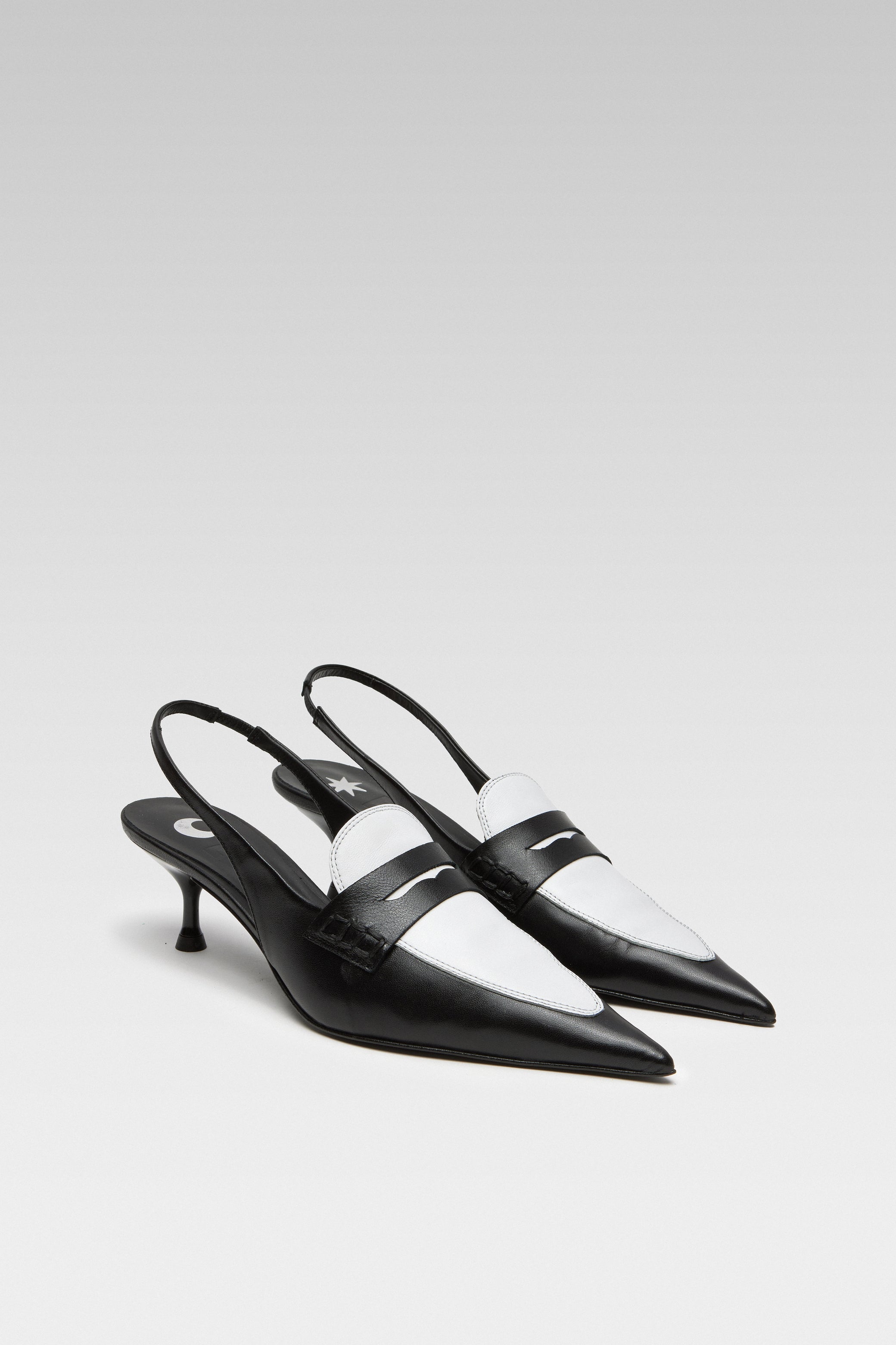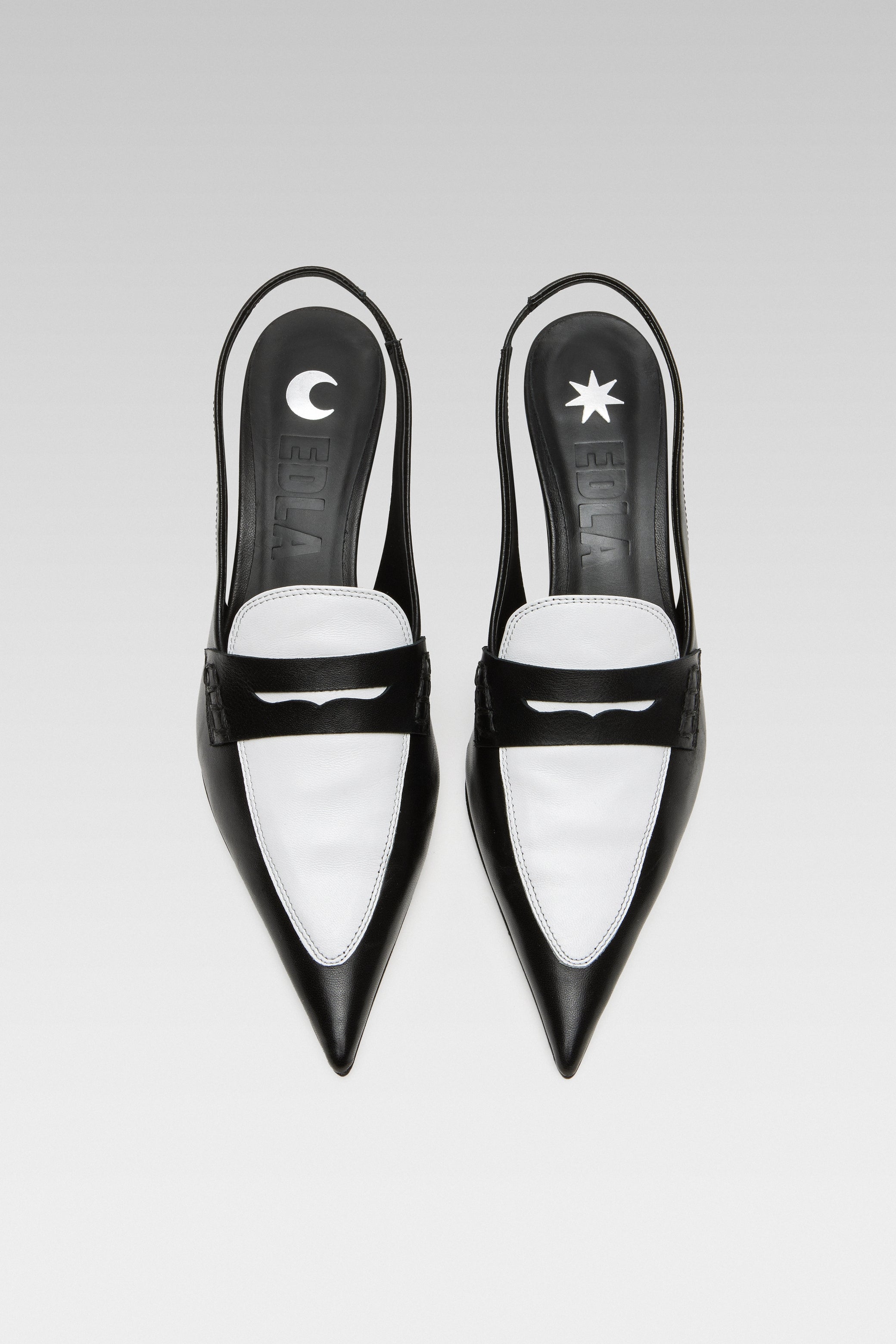 Crafted in soft nappa lambskin, the Uranus Black and White Slingback Pump features a pointed toe, penny loafer-inspired band, and a 5cm kitten heel. Finished with EDLA's signature cosmic insoles.